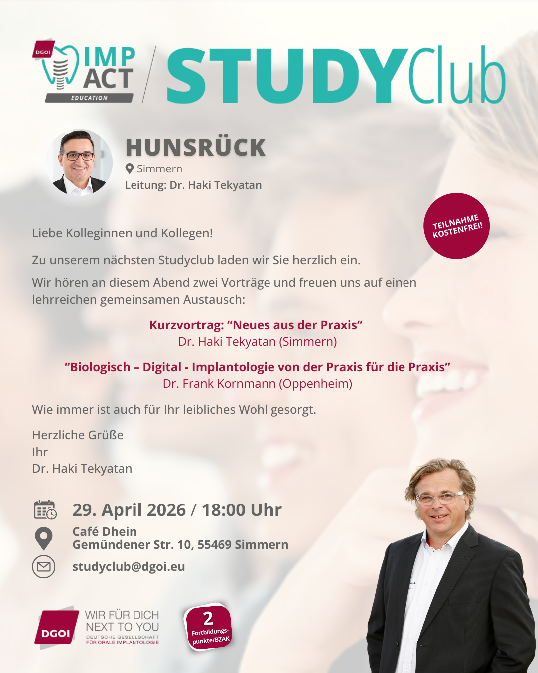 Dr. Haki Tekyatan engagagiert sich als Leiter des Studyclubs Hunsrück, einem implantologischen Studienkreis der Fachgesellschaft DGOI. Hier finden Sie aktuelle Fortbildungsveranstaltungen sowohl des Studyclubs als auch anderer Veranstalter.